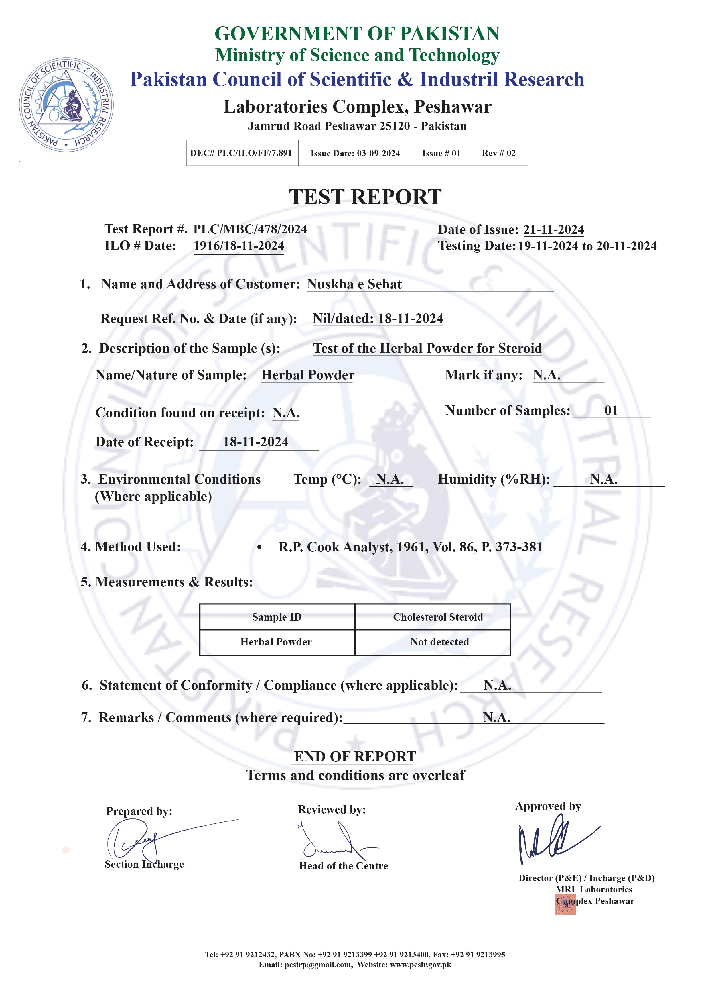 Hamari formulas ko Pakistan Council of Scientific & Industrial Research (PCSIR) ne Test aur Approve kiya hai, jo Purity, Safety, aur Effectiveness Ensure karta hai. Har Batch Strict Quality Standards ko follow karta hai — Taake aap Confidently use kar saken.
